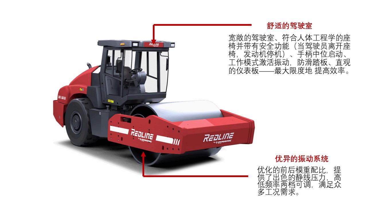 为了达到较好的压实效果,DRS230D/S,DRS260D/DS加强了钢轮结构,通过优化前后模重比例, 使静态线性压力得到了大大提高,从而对作业面起到有效压实。创新的设计,提高了设备面对 挑战性工况的工作性能及效率。